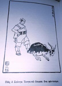 «Μα, φοβόμαστε μην μας φτύσουν», αποκρίθηκε ο άλλος και τότε ο Τσεν πήρε μια βαθιά ανάσα και έφτυσε και τα δυο φαντάσματα στο πρόσωπο. Εκείνα έπεσαν καταγής κοιτώντας τον θυμωμένα. «Δεν είσαι φάντασμα;» απαίτησαν να μάθουν με μια φωνή.